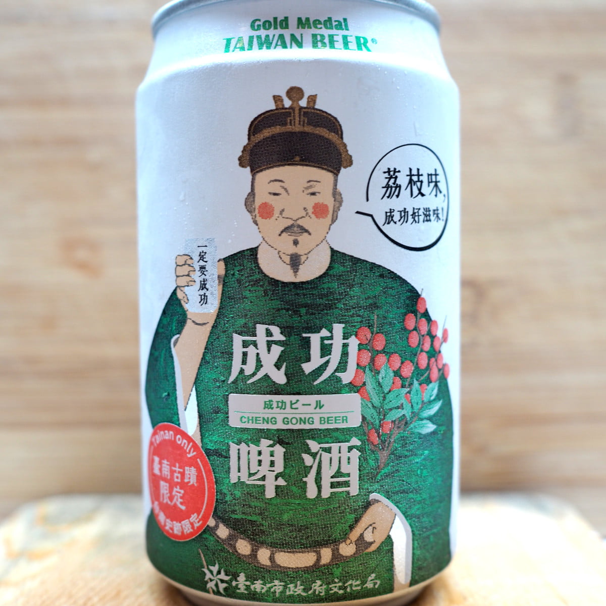 Beer reviews are not my usual topic on this blog. Additionally, I am more a beer gourmand rather than a beer connoisseur. However, I thought it might be interesting to hear my opinion about this special beer. The so-called Cheng Gong Beer is only available in Tainan and sold at these tourist spots: Anping Ancient Castle, Chikan Tower, Yanping County King’s Ancestral Hall, Anping Tree House, Yizai Jincheng, Patriotic Women’s Hall, 1661 Taiwan Shipyard, Sany House (安平古堡、赤崁樓、延平郡王祠、安平樹屋、億載金城、愛國婦人會館、1661臺灣船園區、三一宅藝空間). It is a special edition beer brewed by the Shanhua Brewery, which belongs to the Taiwan Tobacco and Liquor Company (TTL). The brewery is also known by its old name Chenggong Brewery, which means Success Brewery. The name of the beer is therefore a reference to the old name of the brewery. The idea behind the beer is to promote history and culture of Tainan. Besides the litchi flavor there is also a lager beer, as well as other products themed to Chenggong such as potato chips. More information about the beer can be found here. And a little bit about the background here.